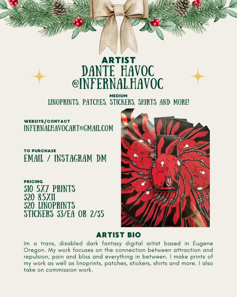 I’m a trans, disabled dark fantasy digital artist based in Eugene Oregon. My work focuses on the connection between attraction and repulsion, pain and bliss and everything in between. I make prints of my work as well as linoprints, patches, stickers, shirts and more. I also take on commission work.