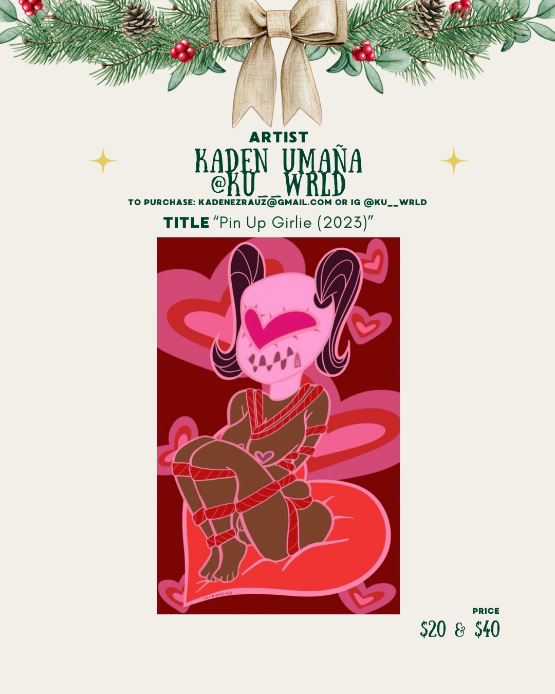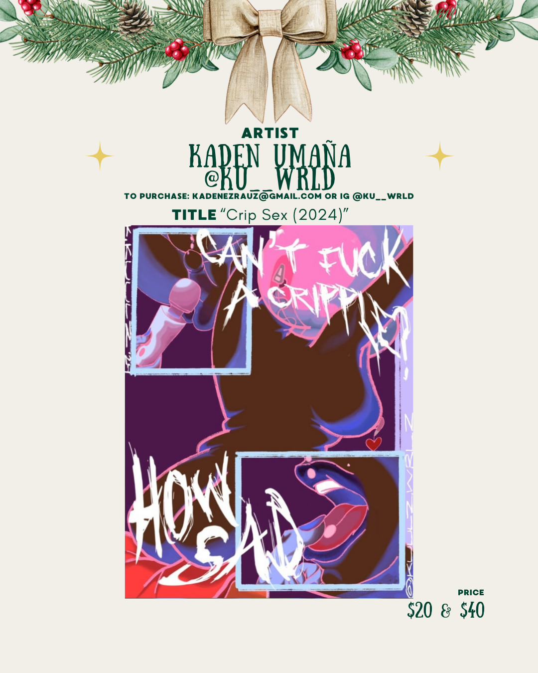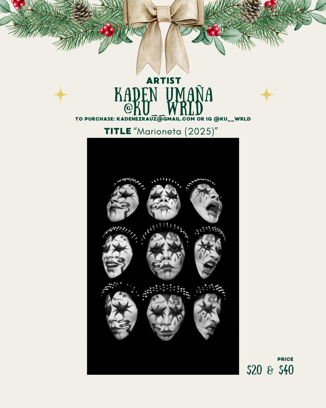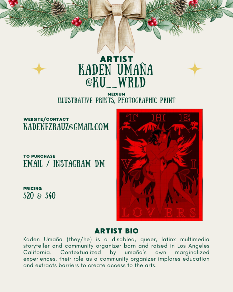 Kaden Umaña(they/he) is a disabled, queer, latinx multimedia storyteller and community organizer born and raised in Los Angeles California. Contextualized by umaña’s own marginalized experiences, their role as a community organizer implores education and extracts barriers to create access to the arts.