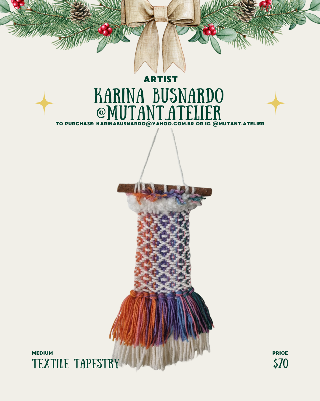 I am a Brazilian artist currently living in Houston. I work with textile art using looms and crochet. I am also a photographer and create collage artwork.