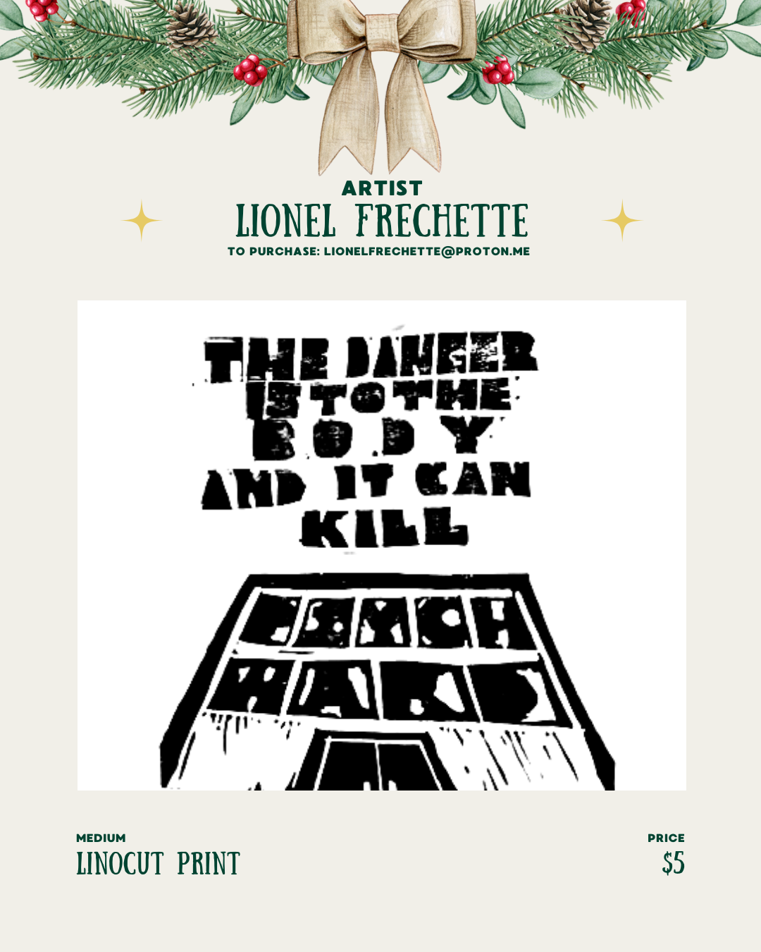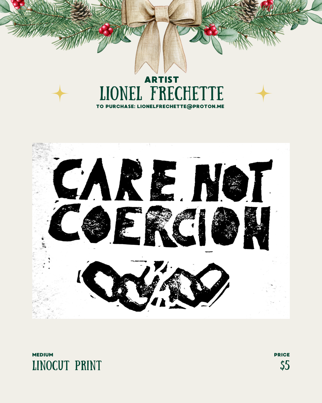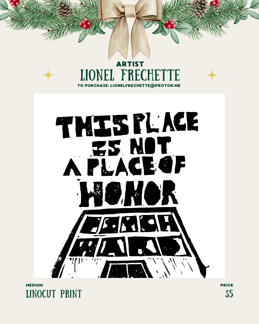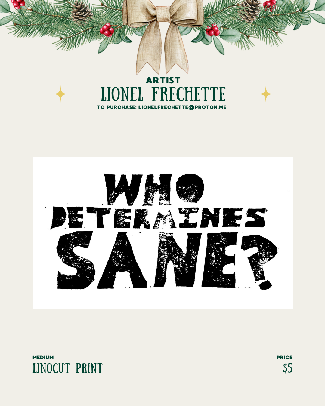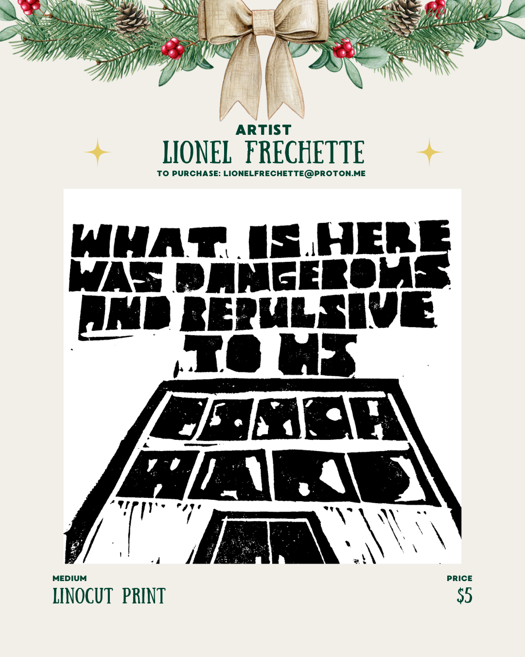 Some of what I’ve done can be found at lionelfrechette.com ; the website focuses predominantly on art re: psych liberation. I do a lot of linocut work, but enjoy acrylic painting, digital art, ink, etc. I do commissions.