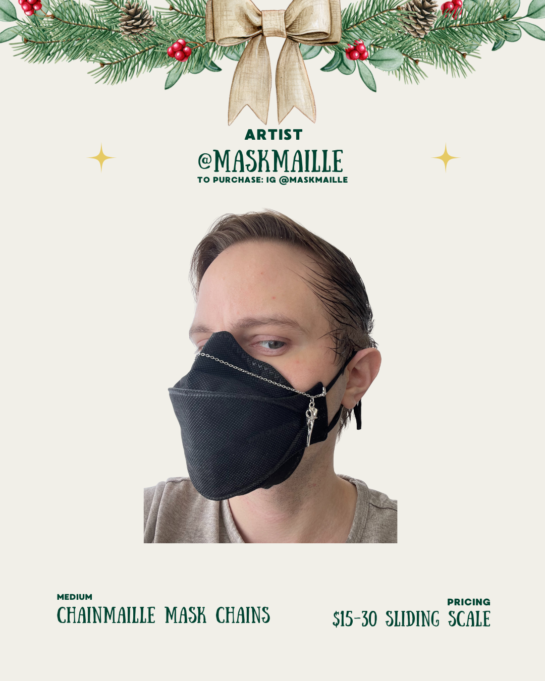 A holiday-themed paA holiday-themed page with one large photo of a person wearing a black mask with a thin silver chain attached. Small silver charms hang on one side. Text lists the artist as @MaskMaille and the item as a chainmaille mask chain costing $15–30.ge with one large photo of a person wearing a black mask with a thin silver chain attached. Small silver charms hang on one side. Text lists the artist as @MaskMaille and the item as a chainmaille mask chain costing $15–30.