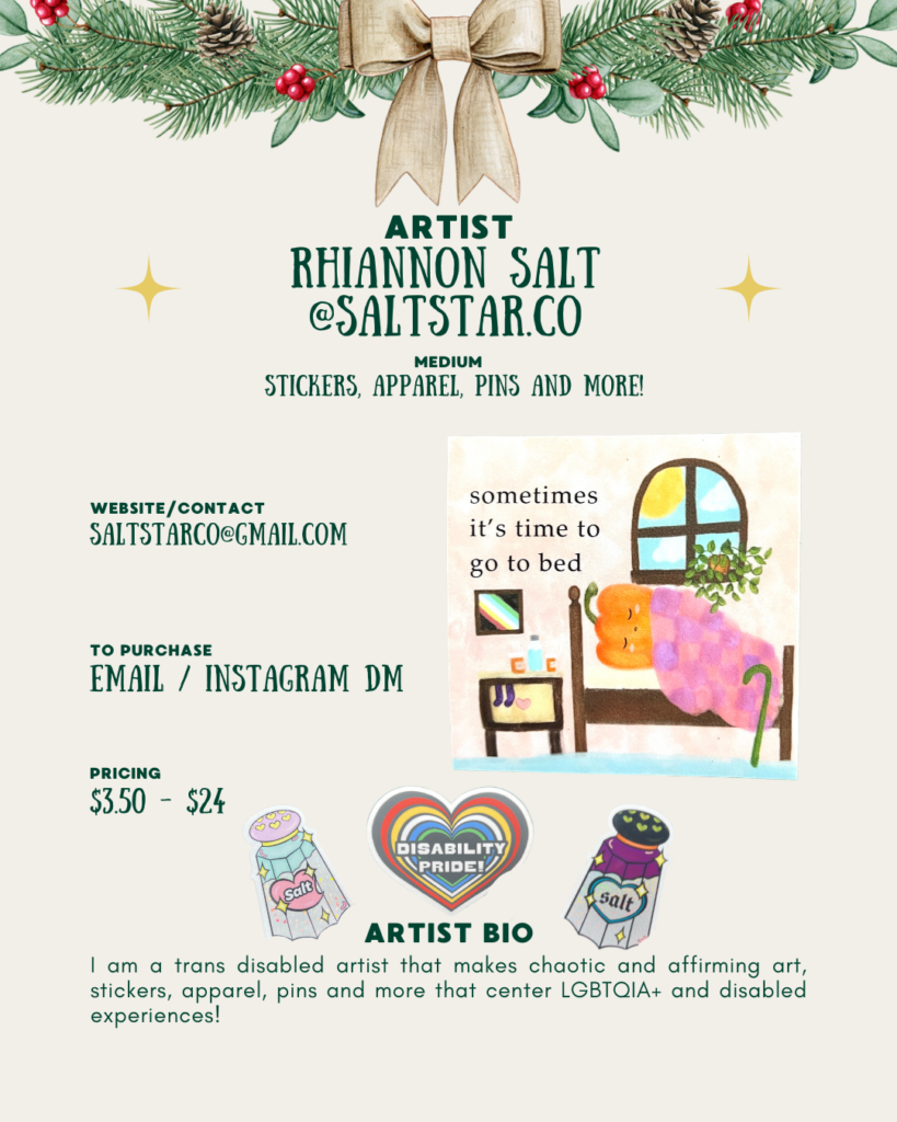 I am a trans disabled artist that makes chaotic and affirming art, stickers, apparel, pins and more that center LGBTQIA+ and disabled experiences!