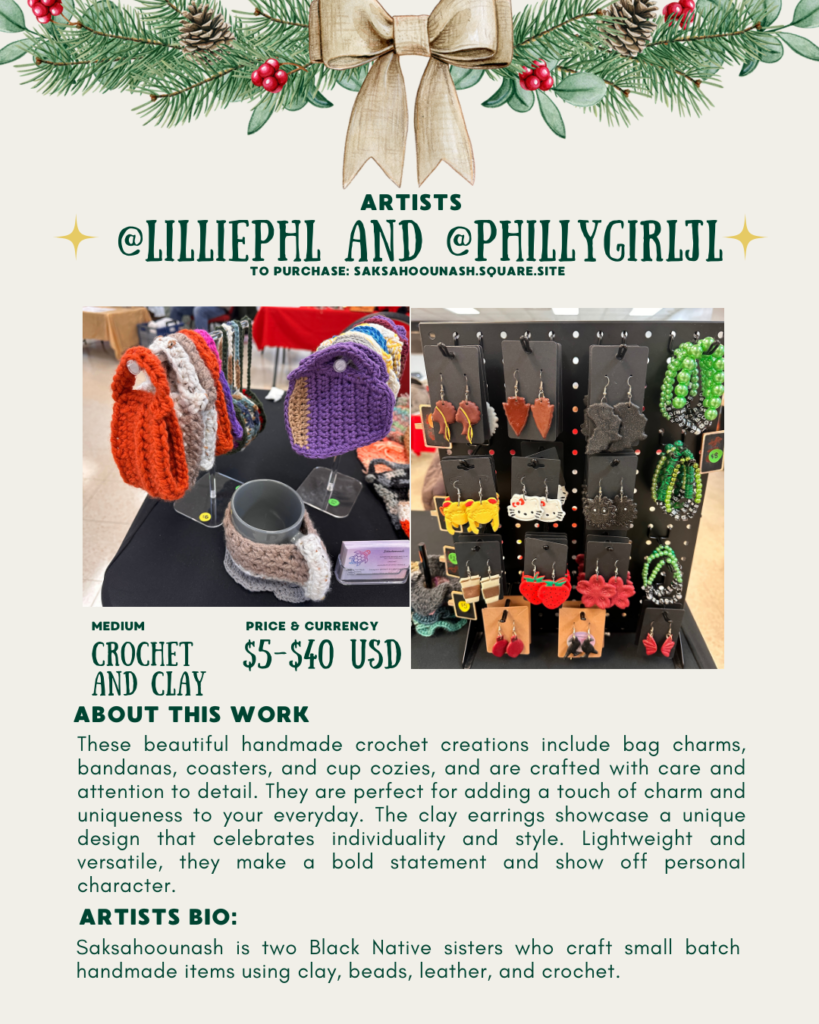 Saksahoounash is two Black Native sisters who craft small batch handmade beaded and clay jewelry and crochet home goods.