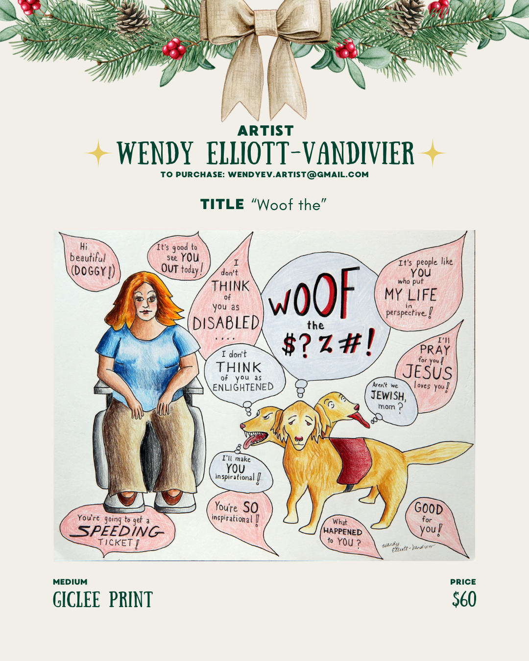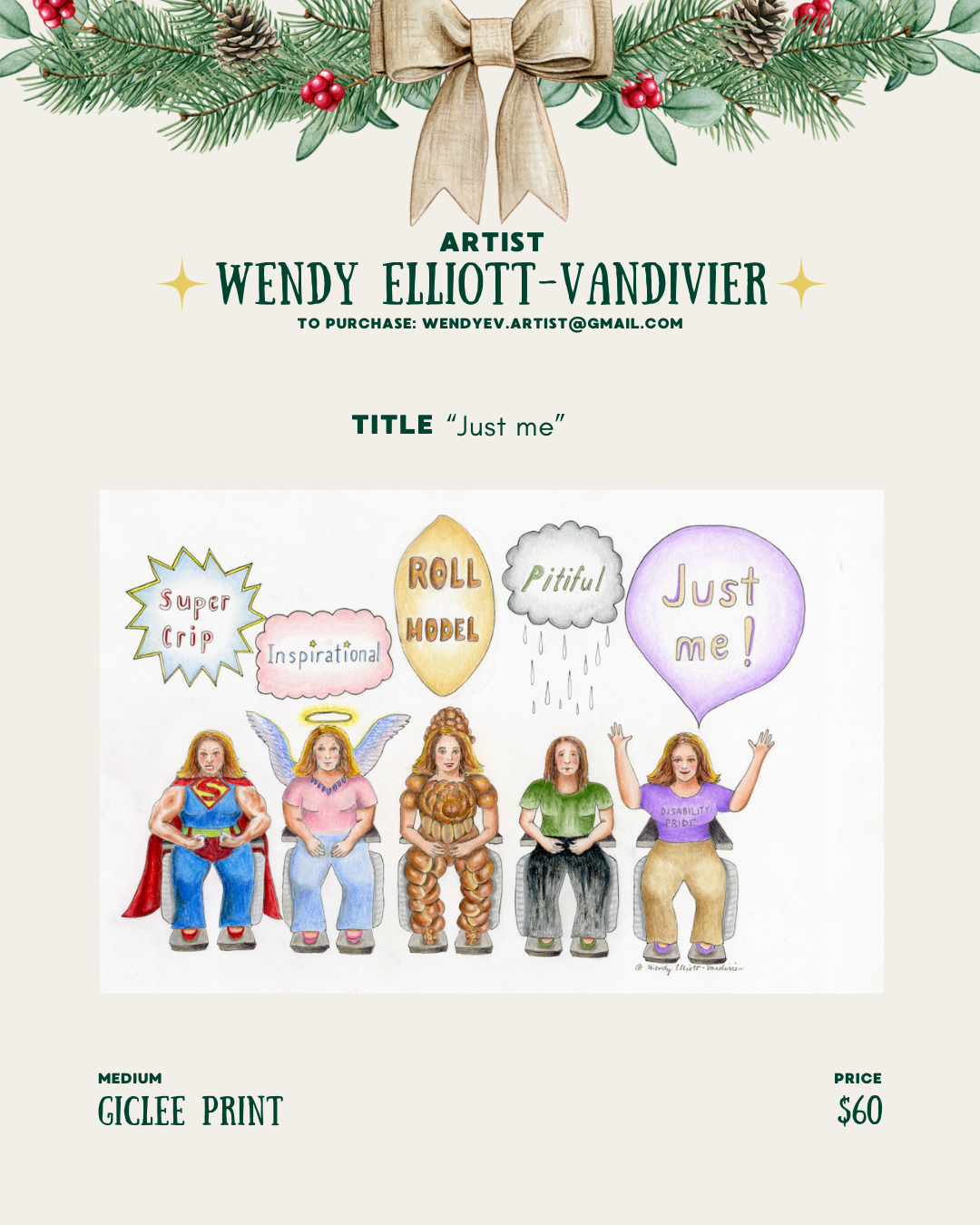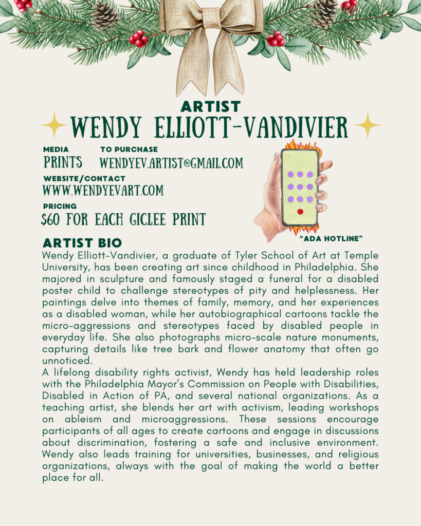 Wendy Elliott-Vandivier is a graduate of Tyler School of Art, Temple University. She has been making art since she was a young child growing up in Philadelphia. In college, she majored in sculpture and staged a funeral of a disabled poster child to lay stereotypes of pity and helplessness firmly to rest. Her paintings explore issues of family, memory and experiences as a disabled woman. Her autobiographical cartoons focus on attitudinal barriers and stereotypes regarding disabilities, and some of the micro-aggressions that disabled people experience while living normal, “un-inspirational” lives. She is also a photographer of micro-scale monuments in nature, and is often inspired by close-up images that people often do not notice in daily life – tree bark, dead leaves, flower anatomy, and water.