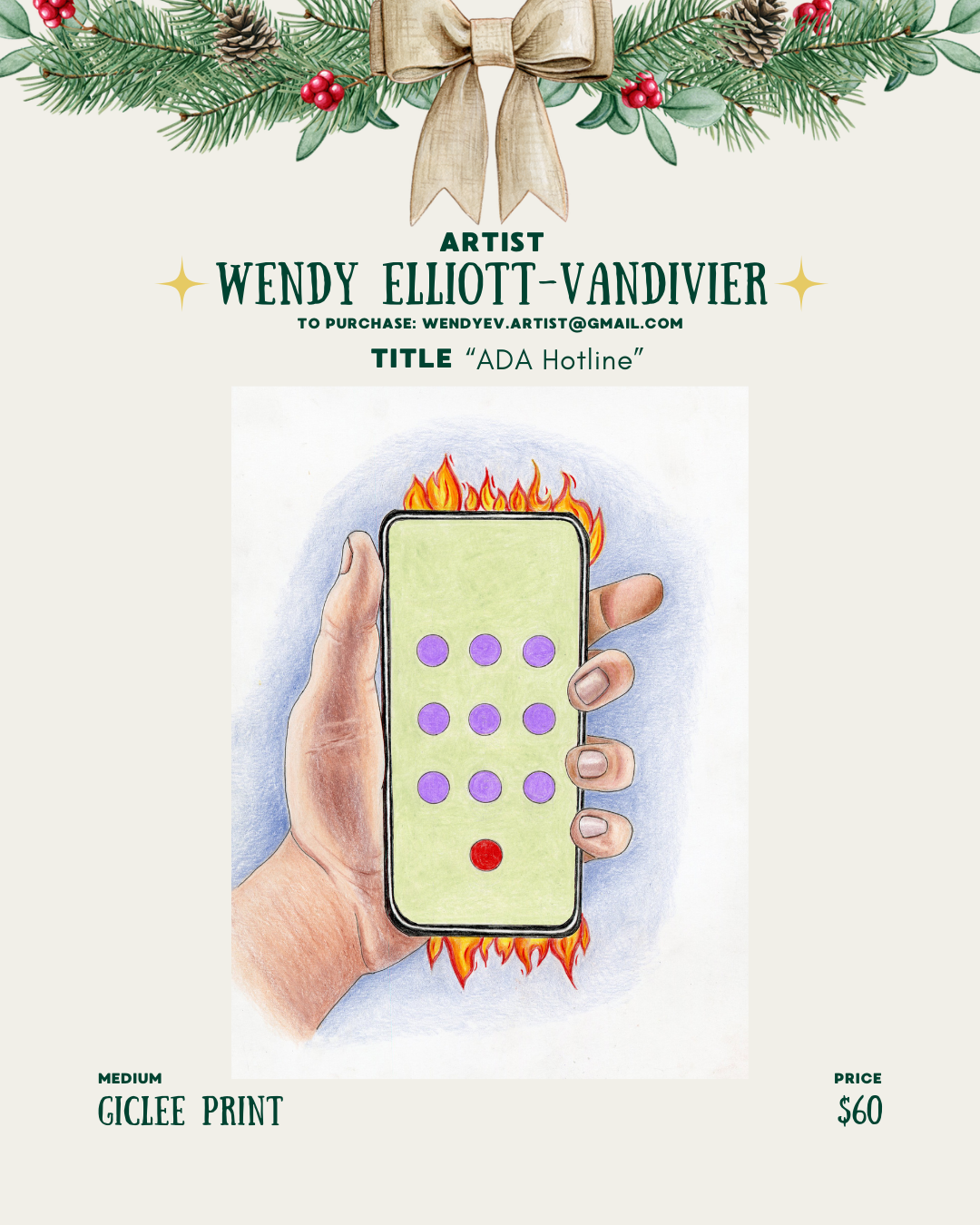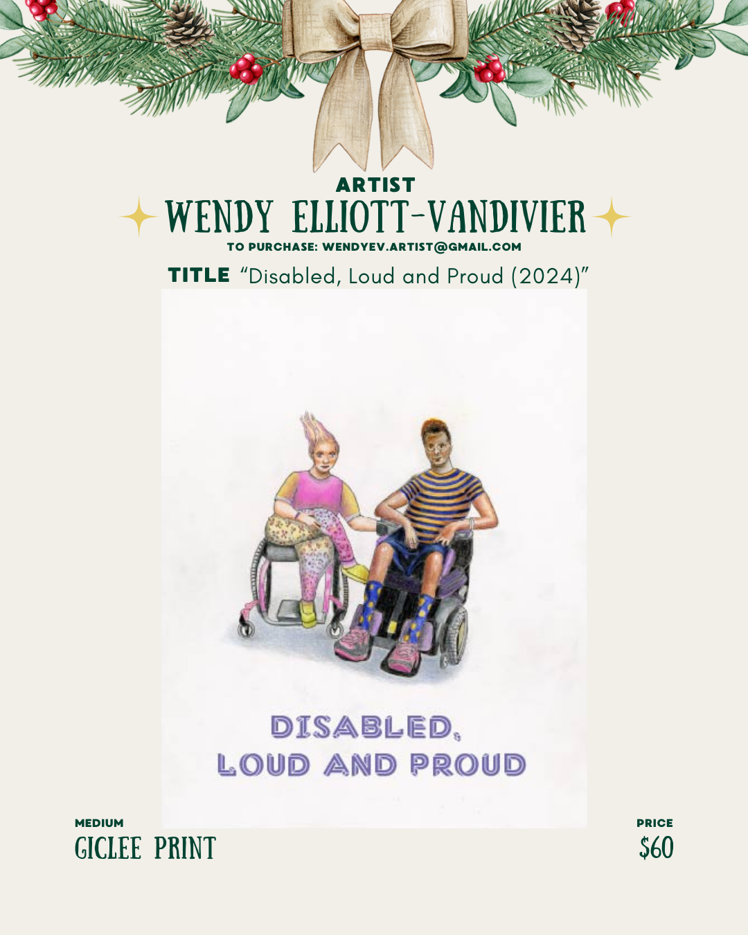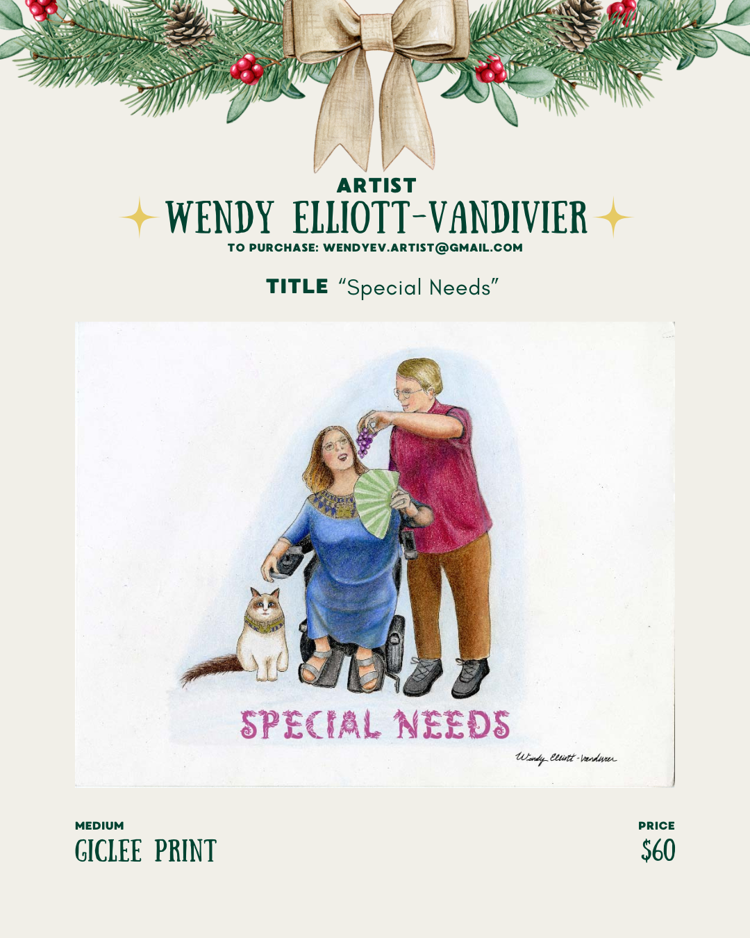 Wendy Elliott-Vandivier is a graduate of Tyler School of Art, Temple University. She has been making art since she was a young child growing up in Philadelphia. In college, she majored in sculpture and staged a funeral of a disabled poster child to lay stereotypes of pity and helplessness firmly to rest. Her paintings explore issues of family, memory and experiences as a disabled woman. Her autobiographical cartoons focus on attitudinal barriers and stereotypes regarding disabilities, and some of the micro-aggressions that disabled people experience while living normal, “un-inspirational” lives. She is also a photographer of micro-scale monuments in nature, and is often inspired by close-up images that people often do not notice in daily life – tree bark, dead leaves, flower anatomy, and water.